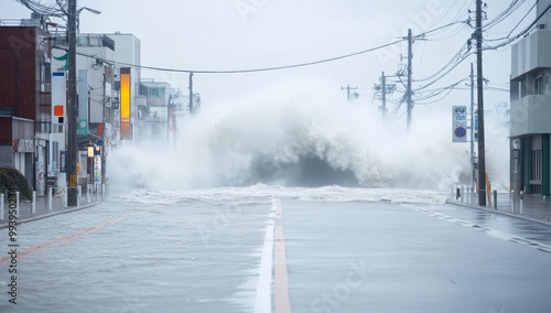Dramatic scene of a Japanese city street engulfed by powerful storm waves, illustrating nature’s force and urban vulnerability during a massive storm event.