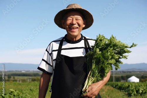 Close-up of a smiling farmer in his 50s holding fresh produce under a sunny sky on a vibrant farm field
