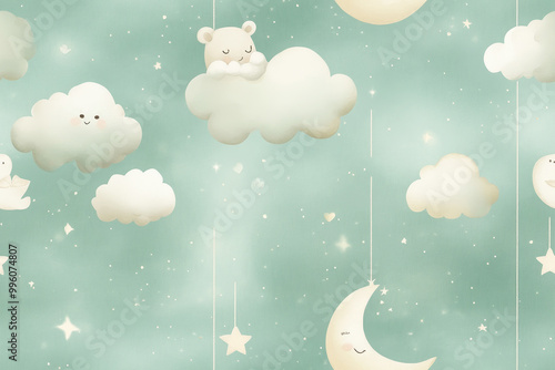 Seamless pattern of cute stars, moons, and clouds with smiling faces