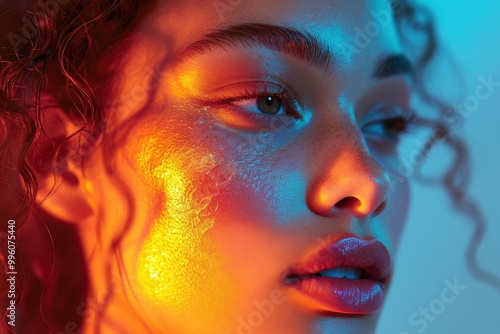 Close-up portrait of a young woman with vibrant skin under bold colorful lighting