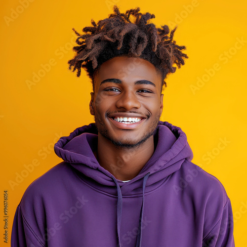 Portrait of a smiling young African American man in a purple hoodie against an orange background exuding positivity and warmth