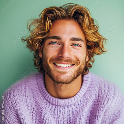 Portrait of a smiling man with golden curly hair wearing a purple sweater against a green background, conveying happiness and warmth.