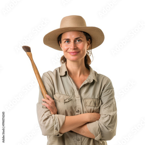 Confident female archaeologist with brush and hat isolated on white