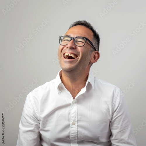 Joyful middle-aged Israeli man with short black hair and glasses laughing in a white shirt against a neutral background