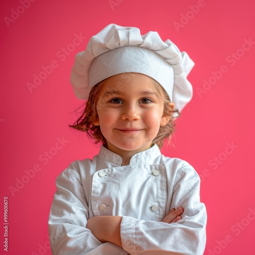 Adorable child dressed as a chef posing confidently with arms crossed against a pastel background, showcasing imagination and dreams.