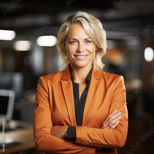 Confident smiling businesswoman in office setting with crossed arms