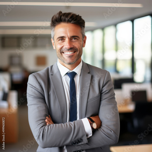 Confident mature Caucasian businessman in his 50s with short gray hair wearing a suit and tie against a neutral background