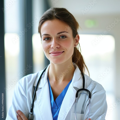 Confident female nurse in scrubs with a friendly smile in a hospital setting